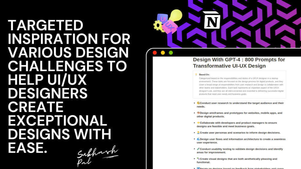 The starter version of "Design With GPT-4" offers 250 prompts covering various responsibilities and duties of a UI-UX designer. Whether you're a beginner or a seasoned pro, our prompts will help you come up with innovative design ideas that will impress your clients and set you apart from the competition.